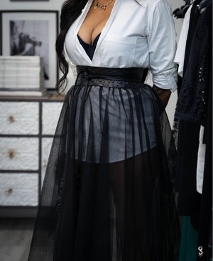 This high‑waisted black tulle skirt is designed with three soft, layered panels that create an effortless A‑line shape. The structured waistband gives it a smooth, secure fit that sits comfortably at the waist without adding bulk. The layers move beautifully when you walk, giving it that sexy, slightly edgy feel while still staying classy and polished. This women’s high‑waisted A‑line tulle skirt is a versatile piece you can dress up or down—pair it with a fitted top for a sleek evening look or keep it simple with a clean tee for everyday style. It’s a modern wardrobe staple for women who want something feminine, elevated, and easy to wear for events, dinners, photoshoots, or special occasions.